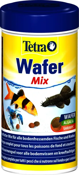 Tetra TetraWafer Mix to wieloskładnikowy, podstawowy pokarm w formie wafelków (utwardzanych krążków) dla mięsożernych i roślinożernych ryb dennych oraz skorupiaków. Stanowi połączenie dwóch rodzajów krążków, zielonych oraz brązowych. Zielone wafelki, z dodatkiem pożywnych alg Spirulina, przeznaczone są dla ryb roślinożernych strefy przydennej, natomiast wafelki koloru brązowego przeznaczone są dla ryb mięsożernych strefy przydennej. Pokarm doskonale nadaje się dla żyjących w toni ryb mięsożernych (kiryski, bocje itp.), roślinożernych (glonojady) i drobnych skorupiaków (kraby, krewetki itp.).Skład