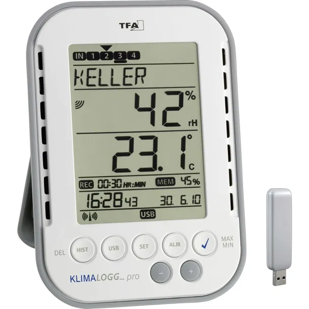 Jedną z najważniejszych funkcji modelu TFA 30.3039.IT HygroLogg Pro jest wbudowany rejestrator danych. Urządzenie może zapisać do 50 000 pomiarów, które można odczytać bezpośrednio na wyświetlaczu lub przeanalizować na komputerze przez interfejs USB.