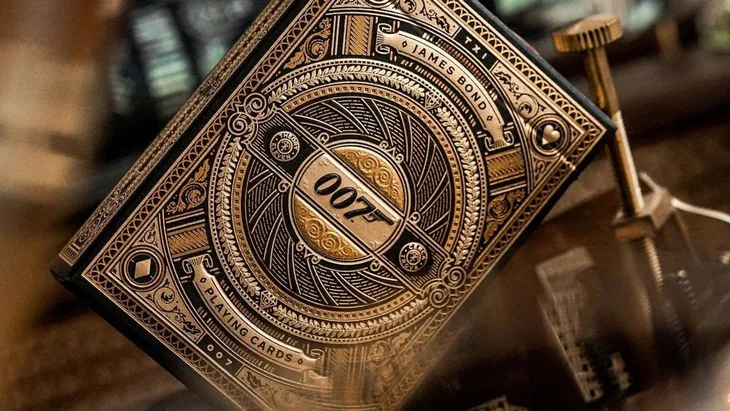 Theory11 produkuje najlepsze na świecie karty do gry, a te są tego najlepszym przykładem. Pudełko jest pokryte dwiema warstwami złotej folii, a na tylnej ściance znajduje się rzeźbione, trójwymiarowe tłoczenie herbu rodziny Jamesa Bonda.