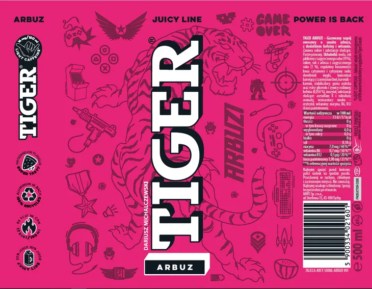 Tiger - Juicy Line - Light caffeine- lekkość dzięki zmniejszeniu o 56% zawartości kofeiny względem Tiger Classic