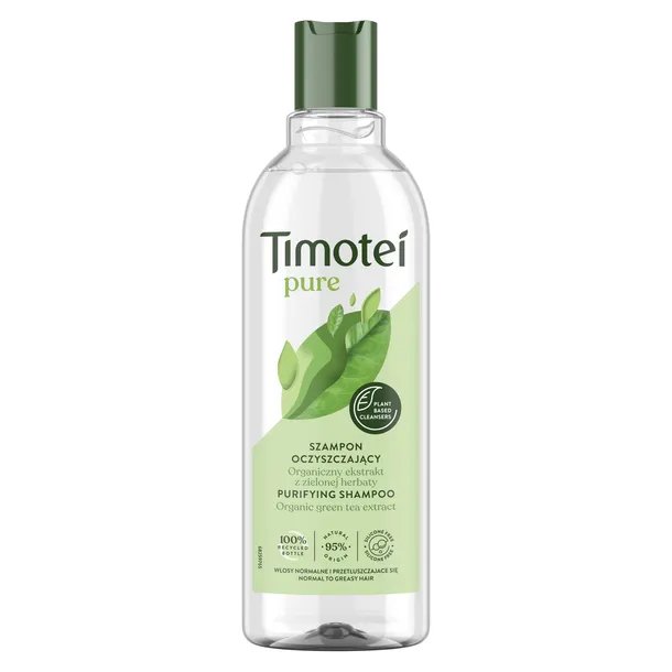 Szampon Timotei Pure do włosów normalnych lub przetłuszczających się. Wzbogacony 100% naturalnym wyciągiem z zielonej herbaty sprawia, że Twoje włosy są odświeżone i lekkie. 0% parabenów, silikonów i barwników.