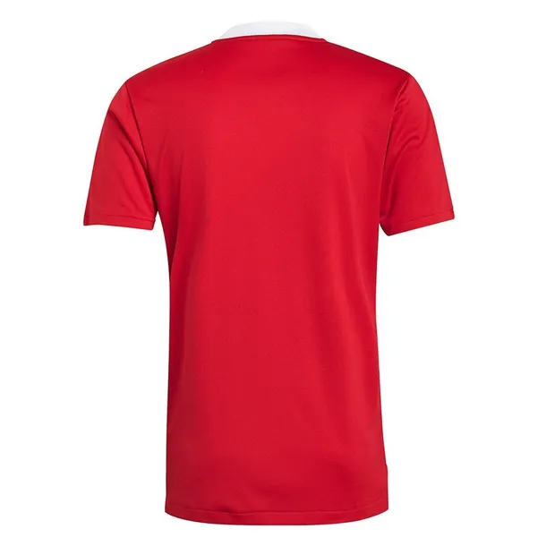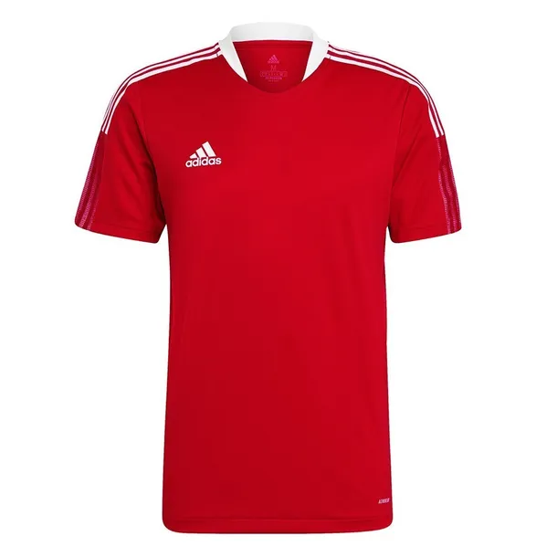 Koszulka męska marki Adidas z kolekcji Tiro 21, w kolorze czerwonym z białymi dodatkami. Wykonana z wysokiej jakości poliestru pochodzącego z recyklingu, co przyczynia się do zmniejszenia emisji szkodliwych dla środowiska substancji. Materiał został wzbogacony o technologię Aeroready, która odpowiada za pochłanianie wilgoci oraz zapewnia właściwości wentylacyjne. Wszystko to sprawia, że materiał jest szybkoschnący i bardzo praktyczny. Sportowy krój z przedłużonym tyłem i wycięciami po bokach gwarantuje swobodę ruchu nawet przy dynamicznych treningach. Po bokach koszulki Adidas umieszczono siateczkowe panele, które jeszcze bardziej dbają o odczuwanie świeżości i odpowiednią wentylację. Minimalistyczne białe logo marki i charakterystyczne dla marki trzy paski dodają sportowego charakteru, a dekolt wycięty w delikatny serek z białym kołnierzykiem urozmaicają klasyczny i prosty design. Wysoka jakość materiałów i idealne dopracowanie techniczne gwarantują komfort na wysokim poziomie podczas sportowych rywalizacji czy treningów różnego rodzaju. Produkt jest nowy, posiada oryginalne metki.
