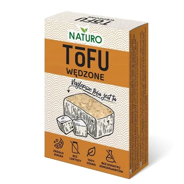 Tofu wędzone to produkt najwyższej jakości, który powstaje z soi a jej zawartość to ponad 90% co daje bardzo wysoką zawartością białka sojowego, wapnia oraz fosforu. Stanowi bardzo dobrą alternatywę dla mięsa, dlatego szczególnie ważne jest w diecie wegetarian i wegan. Ten rodzaj tofu idealnie odwzorowuje smak i aromat produktów wędzonych takich jak sery czy też mięso. Nasze tofu nie wymaga składowania w lodówkach, po jego otwarciu przechowywać w lodówce. Produkt przeznaczony dla osób dorosłych i dzieci powyżej 3 roku życia z wyjątkiem osób z nietolerancją na składniki produktu.