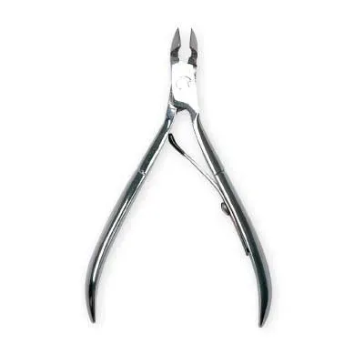 Cążki do skórek chromowane, srebrne, z pojedyńczą sprężyną. Długość całkowita cążek wynosi 9 cm, a długość ostrza 5 mm.