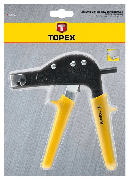 Nitownica TOPEX (nr ref. 43E791) do kołków rozporowych do płyt kartonowo gipsowych, do kołków o średnicach od 3 do 6 mm. Solidna stalowa rękojeść górna i korpus nitownicy. Marka TOPEX skierowana jest do majsterkowiczów.