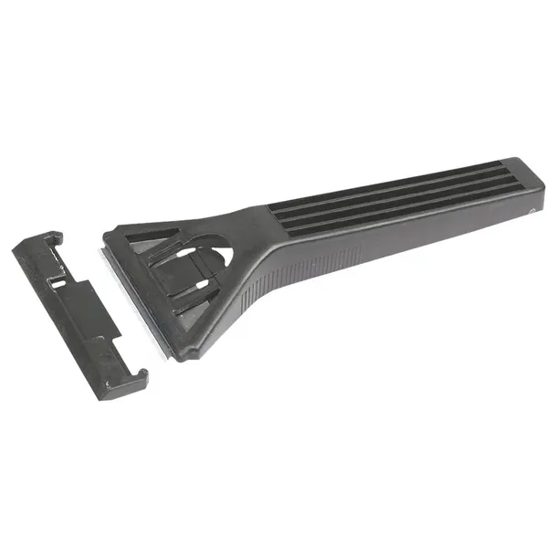 Skrobak z dwoma ostrzami i osłoną. Idealny do usuwania ciężkich zabrudzeń. Rączka wykonana z tworzywa sztucznego, stalowe ostrza.