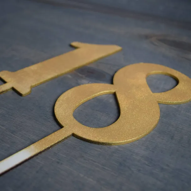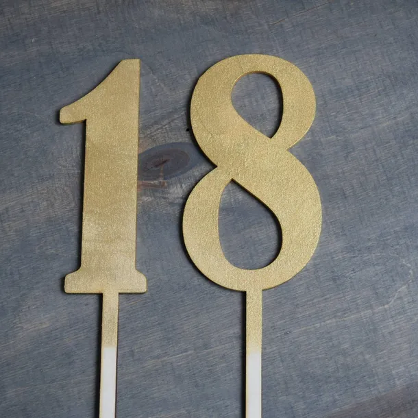 Topper na 18 urodziny. Wykonany ze sklejki 3 mm, ręcznie malowany. Wysokość cyfr 15 cm, wysokość patyczka 10 cm.