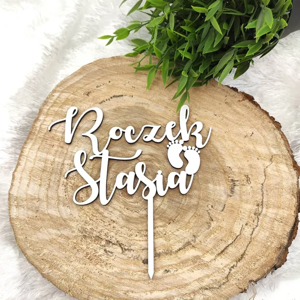 Topper na roczek. Wykonany ze sklejki 3mm, ręcznie malowany na wybrany przez Państwa kolor. Elementy ozdobne w postaci stópek dodają mu uroku.