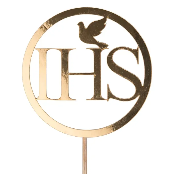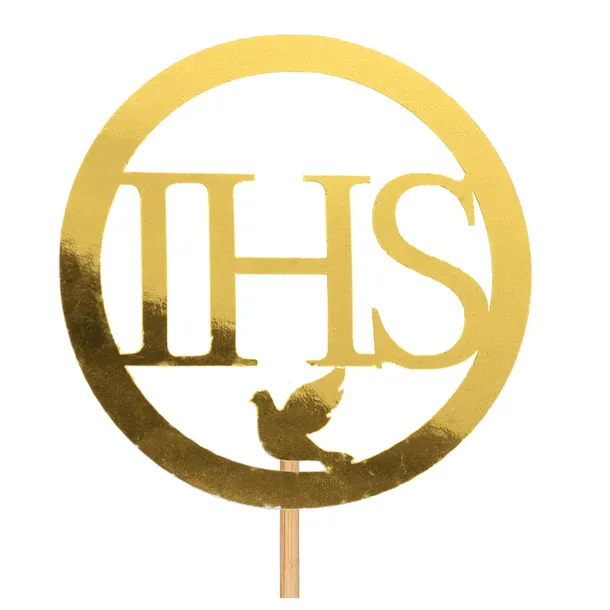 - Piękny komunijny topper na kształt koła. W wewnętrznej stronie znajduje się napis IHS wraz z małym gołąbkiem.