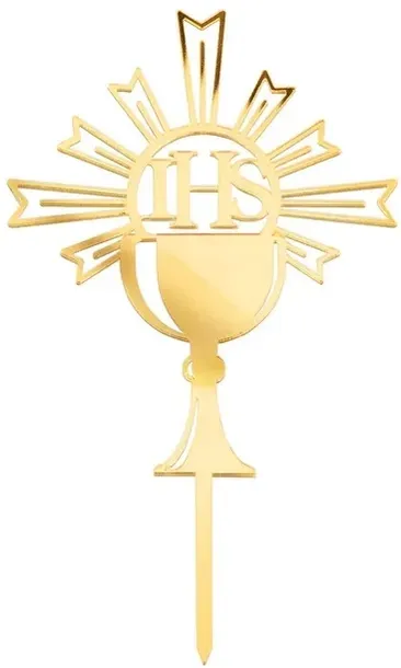 Topper na tort jednostronny w kolorze złotym, który tworzy Kielich Komunia Święta z napisem IHS.