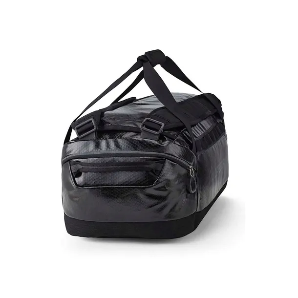 Ta torba turystyczna to idealne rozwiązanie dla osób podróżujących samochodem, autokarem czy samolotem. Kształt jej jest prostokątny więc bez problemu wpasuje się w przestrzeń bagażnika. Od strony wewnętrznej na klapie mamy do dyspozycji kieszeń z siatki zapinaną na suwak. Znajduje się w niej uchwyt na klucze. Z boku z jednej strony znajduje się specjalna kieszeń dedykowana do transportu obuwia. Posiada boczne uchwyty do przenoszenia oraz wzmacniane taśmy wszyte z po obu dłuższych stronach torby które mogą służyć do troczenia dodatkowego sprzętu lub do zamocowania torby np. na bagażnik. Do komory głównej dostęp mamy za pomocą suwaka w kształcie litery U, dzięki czemu otrzymujemy łatwy dostęp do całej zawartości. Główną zaletą torby jest możliwość transportowania jej jako plecak dzięki odpinanym, miękkim pasom naramiennym. Kolejnym niezaprzeczalnym atutem jest system składania na czas kiedy nie jest nam potrzebna. Cała, ogromna torba składa się w kostkę i mieści się do specjalnego dołączonego pokrowca do przechowywania. Dzięki temu w momencie jak jej nie potrzebujemy, po spakowaniu zajmuje zdecydowanie mniej miejsca. Dzięki temu zabiegowi mały, foremny pakunek bez problemu przechowamy w szafie na półce. Materiał z którego jest wykonana torba jest niezwykle mocny co pozwoli na transport naprawdę ciężkiego ładunku. Torba wykonana jest z poliestru 900D pochodzącego w 40% z recyclingu pokrytego powłoka z TPU dzięki czemu materiał jest odporny na warunki atmosferyczne.