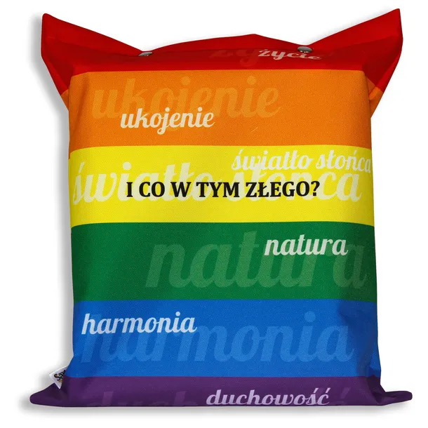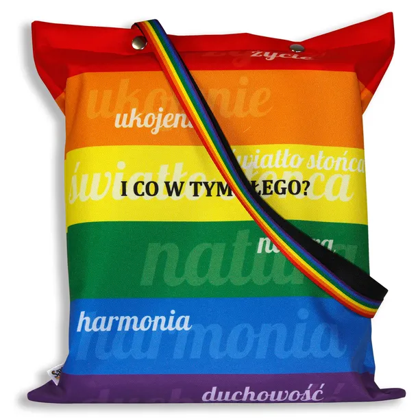 Torba LGBT Hasła - impregnowana, zapinana torba na zakupy w kolorach tęczy symbolizujących wartości najważniejsze dla sympatyków i osób z kręgu LGBT. Wykorzystaliśmy tęczę we współczesnej wersji kolorystycznej: czerwony = życie, pomarańczowy = ukojenie, żółty = światło słońca, zielony = natura, niebieski = harmonia, fioletowy = duchowość. Na tle tęczy i haseł znajduje się napis "I co w tym złego?" - pytanie mające skłaniać do refleksji i chwili zastanowienia...