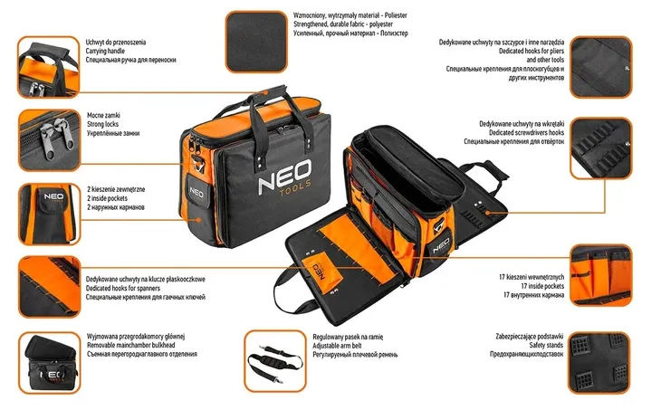 Torba monterska NEO (nr ref. 84-308) poliester 600D, sztywny profilowany uchwyt, 17 kieszeni wewnętrznych, 2 kieszenie zewnętrzne, sztywna konstrukcja, trzy komory główne, wzmocnione zamki, wyjmowana przegroda komory środkowej, gumowe podstawki, pasek na ramię, uchwyt do przenoszenia.