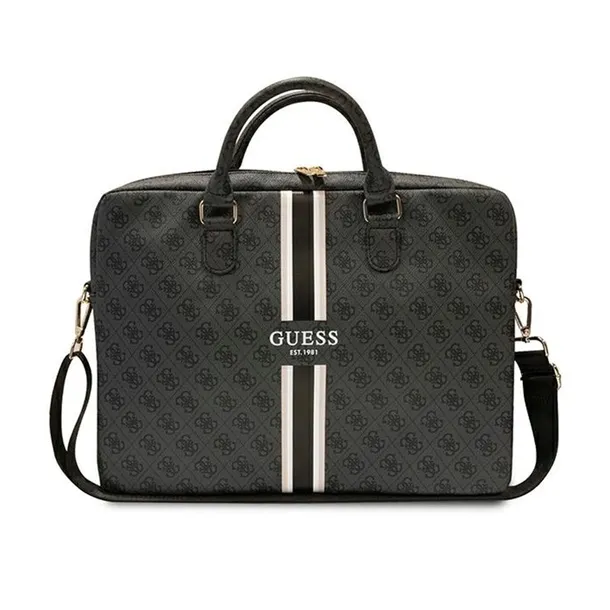 Guess 4G Printed Stripes Computer Bag wysokiej jakości torba na notebooka do 16 cali. Produkt charakteryzuje się jednym z bardziej znanych motywów używanych przez Guess, które umiejscowiono na przyjemnej w dotyku fakturze saffiano. Nadrukowane logo Guess umieszczono na wyróżniającym się pasku, którego kolorystyka doskonale współgra ze stylistyką torby.