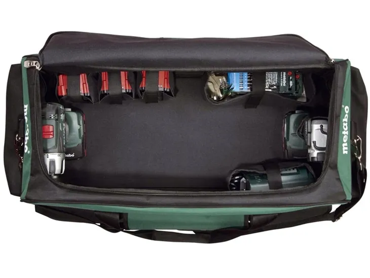 - Wewnątrz torby znajduje się pięć przegród z paskami rzepowymi na trzy akumulatory, ładowarkę i inne akcesoria.
