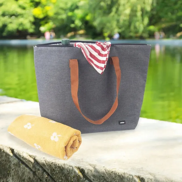 ✅ Zamykana na zamek z dodatkową kieszonką - Wykonana z bardzo wytrzymałej tkaniny poliestrowej, odpornej na uszkodzenia. Torba jest kolorze szarym, a uchwyty w brązowym kolorze. Górna część torby zamykana jest na zamek, a z tyłu wyposażona jest w małą kieszonkę zamykaną również na zamek. Wyściółka termoizolacyjna zapewnia termiczne właściwości.