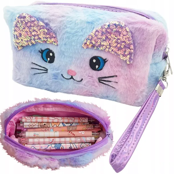 Torebka kotek zapinana na zamek. Wykonana z pluszowego materiału w pastelowych kolorach.