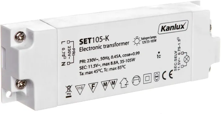 Transformator elektroniczny obniżający przemienne napięcie sieciowe ~230V/50Hz do poziomu 11,5V. Jego zaletą jest wysoka sprawność (małe straty cieplne), niewielkie gabaryty i mała waga. Zamknięty jest w obudowie izolacyjnej z tworzywa sztucznego. Jego przeznaczenie to zasilanie żarówek halogenowych o napięciu 12V AC i łącznej mocy nie przekraczającej 105W.
