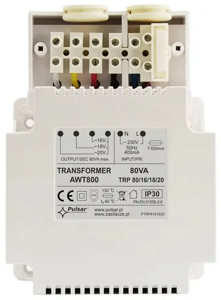 Transformator TRP 80VA/16V/18V/20V Moc: 80VA Zasilanie: 230V/50Hz/0,4A Napięcie wyjściowe: 16V/5A lub 18V/4,5A lub 20V/4A Bezpiecznik termiczny 130ºC Obudowa: PC/ABS V-O, IP30 Gwarancja: 2 lata od daty produkcji