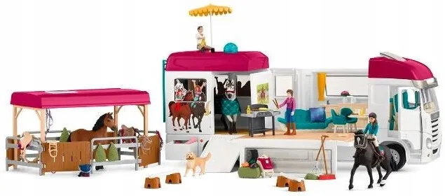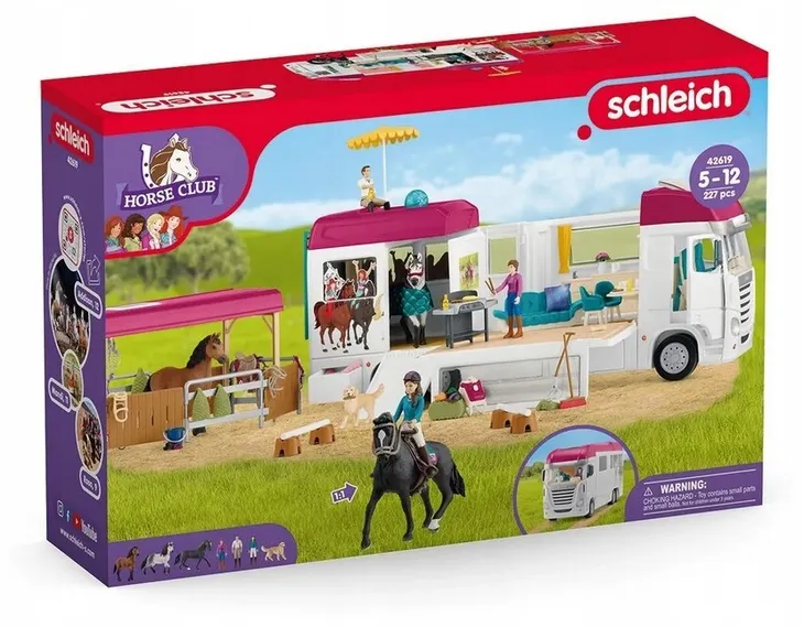Transporter dla koniZaładujcie konie... Czas wyruszyć na wielki pokaz! Zadbaj o swoje zabawkowe konie na wbudowanej stacji pielęgnacyjnej lub ćwicz jazdę na torze przeszkód na padoku. Po długim dniu treningu zrelaksuj się w basenie na dachu przy grillu. Transporter dla koni to idealny prezent, który jest niezbędnym uzupełnieniem kolekcji Horse Club. Zawartość opakowania:1x transporter, 4 siedzenia samochodowe, 1x słomiana wyściółka, 1x stół, 2x krzesła, 1x aneks kuchenny, 1x drabina, 4x ogrodzenie, 4x drewniana wkładka do ogrodzenia, 1x klapa do siedzenia w boksie dla koni, 2x zasłona, 2x drewniana wkładka, 1x plecak, 1x grill, 6x ochraniacze transportowe, 1x szczypce do grilla, 1x kula wodna, 3x kiełbaski, 2x kolby kukurydzy, 1x wąż wodny z końcówką, 1x miotła, 1x widły, 1x pojemnik na wodę z pompką, 2x tyczka, 2x tyczka wisząca ZZ, 2x stojak na siodło, 3x uzda, 3x siodło, 1x bela słomy, 3x talerz, 3x kubek, 1x parasol, 3x butelka, 1x wazon na kwiaty, 3x siatka na siano, 4x pień drzewa, 1x kość, 2x marchewka, 1x siano, 1x bukiet, 1x grzebień, 1x zgrzebło, 3x kask, 1x kask, 1x kanapa, 3x koń, 1x golden retriever, 2x koc z materiału, 3x poduszka, 3x mata pod siodło, 3x kantar stajenny, 1x derka dla koni, 3x figurka czł : 5-12 LataWymiary: 68 x 60 x 38 cm