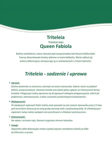 Triteleia Queen Fabiola to wieloletnia roślina cebulowa znana również jako brodia lub hiacynt kalifornijski. Tworzy efektowne, gwiazdkowate, fioletowo-niebieskie kwiaty zebrane w luźne baldachy, które pięknie prezentują się na rabatach i w bukietach.