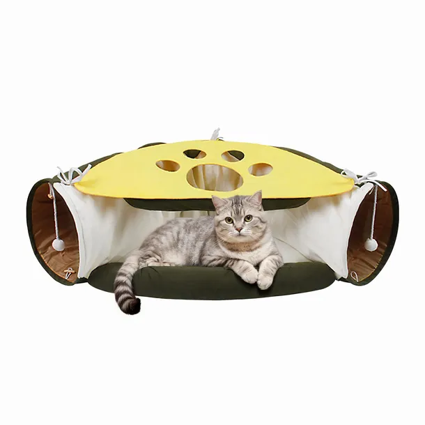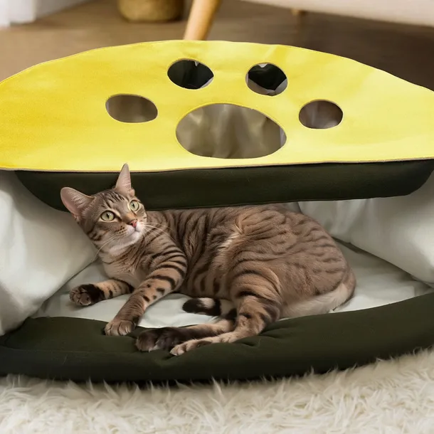 - Namiot w Kształcie Kociej Łapki: Żółty daszek ma wycięte otwory w kształcie kociej łapki, które sprawiają, że cały tunel jest bardziej wyjątkowy i pozwala kotom na dodatkowe wejścia i interakcje.