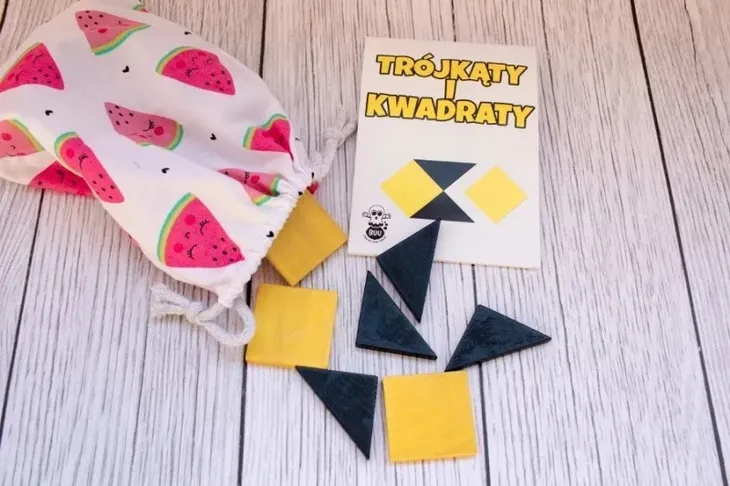 Trójkąty i Kwadraty to łamigłówka (układanka) inspirowana tradycyjnym chińskim tangramem, który znany jest już od ok. 3000 lat! Zestaw zawiera 18 figur: 6 żółtych kwadratów i 12 czarnych trójkątów oraz książeczkę z wzorami do układania. Celem zabawy jest odtworzenie wybranego wzoru z broszury. Układanka rozwija wyobraźnię przestrzenną i kreatywność. Zabawa z TiK może stanowić atrakcyjną formę wprowadzenia do nauki rozróżniania i budowy figur geometrycznych. To doskonały trening logicznego i analitycznego myślenia. Poprawi również koncentrację, zdolności manualne i wpłynie korzystnie na umiejętność dokonywania analizy i syntezy wzrokowej. Sprawdzi się także w przypadku ćwiczeń koordynacji wzrokowo-ruchowej (ręka-oko). Podstawowy wariant zabawy jest wyłącznie inspiracją do samodzielnego tworzenia wzorów oraz wykorzystywania figur geometrycznych do zajęć.