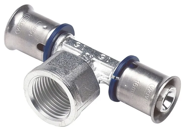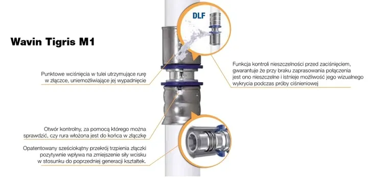 Kształtka zaprasowywana Wavin Tigris M1 wykonana z mosiądzu galwanizowanego i wyposażona w zaprasowywaną tuleję ze stali szlachetnej z funkcją kontroli nieszczelności przed zaciśnięciem, wykorzystywana do instalacji zimnej i ciepłej wody oraz podłączenia instalacji grzejnikowych i podłogowych.