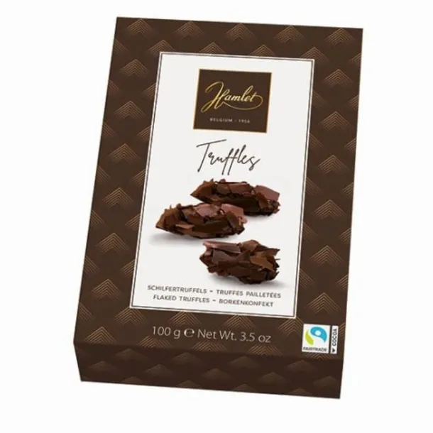Wartości odżywcze: wartość energetyczna 2240 kJ/530 kcal, tłuszcz 33 g (w tym kwasy tłuszczowe nasycone 20 g), węglowodany 55 g (w tym cukry 52 g), błonnik 2 g, białko 5 g, sól 0,12 g.Składniki: cukier, tłuszcz kakaowy, miazga kakaowa, kakao w proszku o obniżonej zawartości tłuszczu, emulgator: lecytyna sojowa, aromaty naturalne. Trufle o smaku ciemnej czekolady, pokryte delikatnymi wiórkami ciemnej czekolady.Producent: Hamlet NVKraj pochodzenia: BelgiaAlergeny: zawiera SOJĘ. Może zawierać MLEKO, ORZECHY i GLUTEN.
