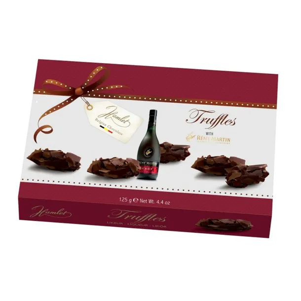 Trufle Hamlet koniak to wykwintne belgijskie praliny czekoladowe, które zachwycą każdego miłośnika słodkości. Każda trufla składa się z delikatnej czekolady wypełnionej aksamitnym nadzieniem z koniakiem Remy Martin, tworząc harmonijną całość, która rozpływa się w ustach. Opakowanie o wadze 125 g zawiera 16 sztuk trufli, co czyni je idealnym wyborem na elegancki prezent lub wyjątkową chwilę relaksu.