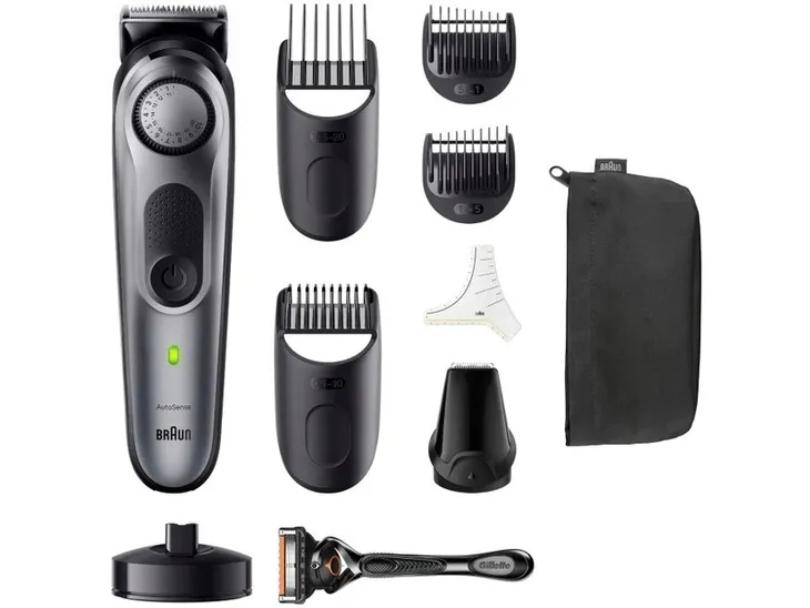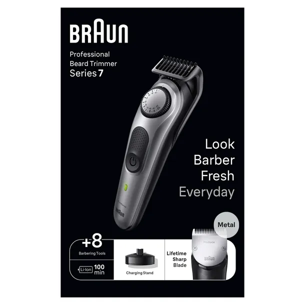 Wyglądaj jak prosto od barbera każdego dnia: najwyższa precyzja i 100% kontroli dzięki profesjonalnemu trymerowi do zarostu Braun 7. Profesjonalne rezultaty przy każdym pociągnięciu: wyłap włoski nawet w trudno dostępnych miejscach dzięki niezawodnym ostrzom ProBlade i uzyskaj równomiernie przycięty zarost z technologią AutoSense. 100% kontroli na wyciągnięcie ręki: wybierz spośród 40 ustawień długości dzięki precyzyjnej regulacji co 0,5 mm, którą zapewnia koło do precyzyjnej regulacji. Swobodnie przycinaj, konturuj i cieniuj w domu: przybory do pielęgnacji premium pomogą Ci dopracować szczegóły stylizacji, osiągnąć równe cieniowanie, a nawet przycinanie, pozwalając na uzyskanie idealnego wykończenia. Stworzony po to, by służyć jak najdłużej: ten trymer dla mężczyzn jest w pełni wodoodporny dla łatwego czyszczenia. Został wyposażony w potężny akumulator litowo-jonowy zapewniający 100-minutowy czas działania bezprzewodowego, niezawodne ostrza, bazę ładującą i kosmetyczkę z zamkiem do przechowywania w łazience. Profesjonalny trymer do zarostu Series 7. Wyglądaj jak prosto od barbera każdego dnia. Profesjonalizm i precyzja. Metalowe ostrze ProBlade wychwytuje włosy w trudno dostępnych miejscach. 100 minut nieprzerwanego cięcia. 100% kontroli na wyciągnięcie ręki. 40 ustawień długości w precyzyjnych odstępach co 0,5 mm. Cieniuj, dopracowuj szczegóły i przycinaj. Swoboda użytkowania w domu. Co jest w pudełku: Profesjonalny trymer do zarostu 7, Precyzyjny trymer, Regulowany grzebień (0,5–10 mm), Regulowany grzebień 10,5–20 mm, Nasadki do cieniowania brody, Szablon do brody, Saszetka, Baza ładująca, Maszynka do golenia Gillette ProGlide.