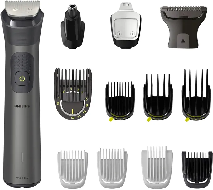 Trymer marki PHILIPS model MG7925/15 Multigroom seria 7000 to kompletny zestaw do pielęgnacji męskiego wyglądu. W jego skład wchodzi wszechstronny trymer do twarzy, ciała i włosów, który oferuje 26 ustawień długości i precyzyjną regulację co 0,2 mm. Dzięki technologii BeardSense, która skanuje gęstość zarostu, golenie staje się jeszcze bardziej precyzyjne. Dodatkowo zestaw zawiera wiele praktycznych akcesoriów, takich jak trymer do nosa i uszu czy golarka do ciała. Trymer jest wodoodporny, wyposażony w samoostrzące się ostrza ze stali i długotrwałą baterię Li-ion. To idealne narzędzie do utrzymania doskonałego wyglądu. Akcesoria w zestawie: pokrowiec, szczoteczka do czyszczenia, USB-A (zasilacz nie wchodzi w skład zestawu).