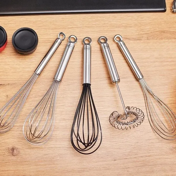 Szeroki rozstaw cienkich drucików i smukły uchwyt bez wysiłku dają lekkie i przewiewne efekty ubijania mieszanek o płynnej lub półpłynnej konsystencji.