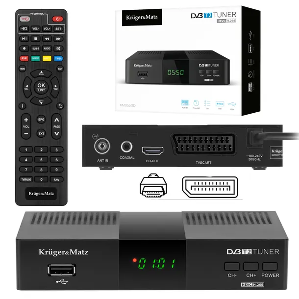 Tuner DVB-T2 H.265 HEVC Kruger&Matz HDMI SCART PVR EPG USB dekoder