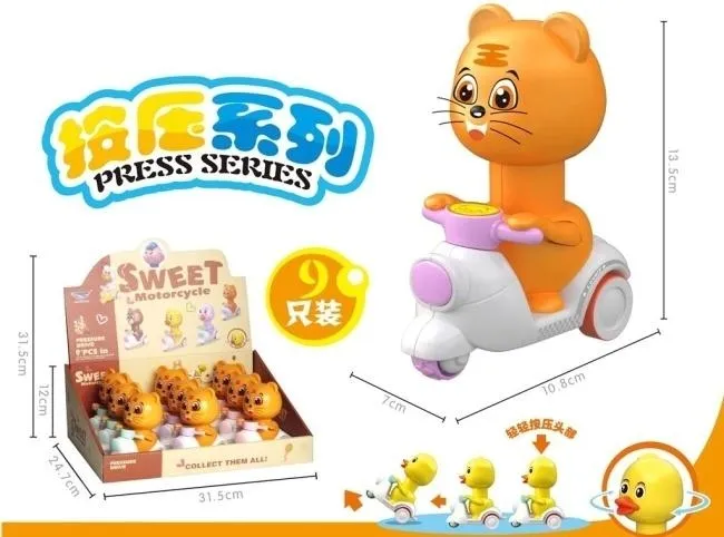 Zabawny Tygrys na Motorze - Radość z Każdym Naciśnięciem! (Opakowanie zbiorcze 9 sztuk) Przedstawiamy niezwykle sympatycznego Tygryska na Motorze, który z pewnością wywoła uśmiech na twarzy każdego dziecka. Ten kolorowy i interaktywny pojazd to prosta, a zarazem wciągająca zabawka. Aby wprawić tygryska w ruch, wystarczy nacisnąć jego głowę, a on pomknie przed siebie, dostarczając mnóstwo frajdy. Zabawka charakteryzuje się prostą obsługą, dzięki czemu nawet najmłodsze dzieci poradzą sobie z nią bez problemu. Kompaktowe rozmiary sprawiają, że tygrysek na motorze idealnie mieści się w małych rączkach i można go zabrać ze sobą wszędzie. Opakowanie zbiorcze zawiera aż 9 sztuk uroczych tygrysków na motorach, co czyni go doskonałym wyborem dla przedszkoli, sal zabaw, jako nagrody w konkursach lub po prostu jako większy zapas ulubionych zabawek. Cena za 1szt.Cechy produktu: Motyw: Tygrys na motorze. Mechanizm: Naciśnij i jedź. Idealny dla dzieci w różnym wieku. Świetny pomysł na drobny upominek lub nagrodę. Spraw radość swoim pociechom i podaruj im tego uroczego Tygryska na Motorze!