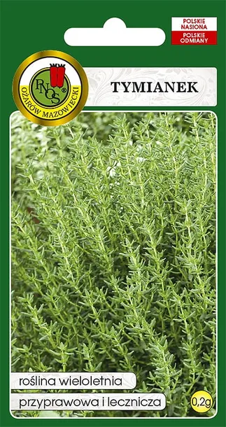 Roślina wieloletnia. Surowcem przyprawowym jest jego ziele, które zawiera olejki eteryczne. TYMIANEK charakteryzuje się aromatycznym zapachem i piekącym, gorzkim smakiem. Ma właściwości wykrztuśne, przeciwkaszlowe, bakteriostatyczne, przeciwzapalne. Pobudza czynność żołądka, uspokaja układ nerwowy. Łatwy w uprawie. Uprawa z siewu wprost do gruntu lub z rozsady.