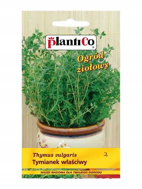Nasiona PlantiCo, zioła. Tymianek właściwy, roślina wieloletnia - bylina. Surowcem są drobne łodygi, ze skórzastymi, szarozielonymi liśćmi, zbiór na początku kwitnienia. Jest rośliną miododajną. Działa dezynfekująco, ściągająco i pobudzająco. Świeży lub suszony dodaje się do b-ionów, marynat, farszów, zup i sosów. Pomaga w trawieniu tłustego jedzenia. Pasuje do potraw gotowanych w winie. W połączeniu z rozmarynem ma działanie przeciwłupieżowe. Wymaga ciepłego, słonecznego i osłoniętego stanowiska.