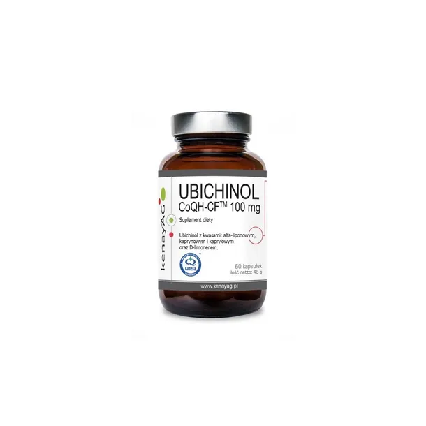 Ubichinol (Kaneka Ubiqunon) z kwasami: alfa-liponowym, kaprynowym i kaprylowym oraz D-limonenem.OPIS:Ubichinol (aktywna forma Koenzymu Q10) - chroniony kwasami: alfa-liponowym, kaprynowym i kaprylowym oraz D-limonenem, przed utlenieniem i krystalizacją.SKŁAD:D-limonen, żelatyna wołowa, ubichinol, substancja wiążąca: gliceryna, kwas kaprylowy, kwas kaprynowy (dekanowy), kwas alfa-liponowy, barwnik: karmel<br /><table border="3"><tbody><tr><td colspan="2">Porcja dzienna:1 kapsułkaOpakowanie zawiera:60 kapsułek </td></tr><tr><td colspan="2">Skład w porcji dziennej (1 kapsułka)Ubichinol (Kaneka Ubiquinol<sup>TM</sup>) – aktywna forma koenzymu Q10Kwas kaprynowy (dekanowy)D-limonenKwas alfa-liponowyKwas kaprylowy100 mg9 mg336 mg<br />6 mg22 mgSPOSÓB UŻYCIA:1 kapsułka dziennieNie należy przekraczać zalecanej porcji do spożycia w ciągu dnia. Suplementy diety nie mogą być stosowane jako substytut (zamiennik) zróżnicowanej diety. Nie należy stosować w przypadku nadwrażliwości na jakikolwiek składnik preparatu. Preparatu nie powinny stosować kobiety w ciąży, karmiące piersią oraz dzieci i młodzież poniżej 18 roku życia.PRZECHOWYWANIE:Przechowywać w ciemnym i suchym miejscu w temperaturze pokojowej, w sposób niedostępny dla małych dzieci.