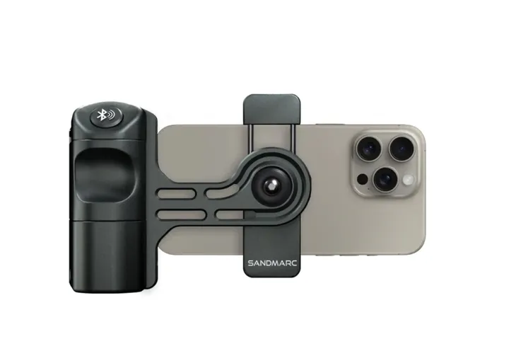 Uchwyt wyróżnia się designem oraz funkcjonalnością. Posiada przycisk Bluetooth*, którym zrobimy zdjęcie lub włączymy nagrywanie, ale został również wyposażony w kilka uniwersalnych opcji montażowych, dzięki którym wyposażymy nasz set w dodatkowe oświetlenie, mikrofon lub przymocujesz go na statywie (2 x zimna stopka, gwint 1/4"), tworząc ze swojego telefonu profesjonalne urządzenie do filmowania.