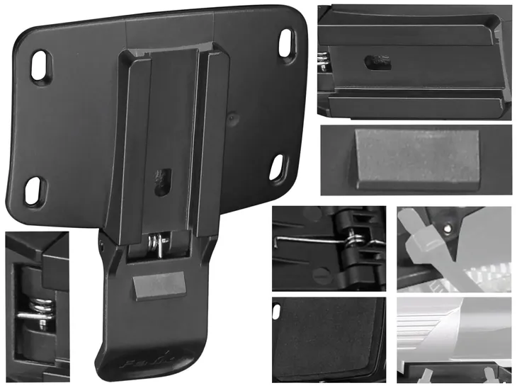 Konstrukcja uchwytu została wykonana z wytrzymałego, a zarazem lekkiego tworzywa PC, które cechuje się odpornością na uszkodzenia mechaniczne oraz jest przyjazne dla środowiska. Montaż jest wyjątkowo prosty i szybki – uchwyt mocowany jest do kasku za pomocą solidnych opasek zaciskowych, bez potrzeby użycia dodatkowych narzędzi.