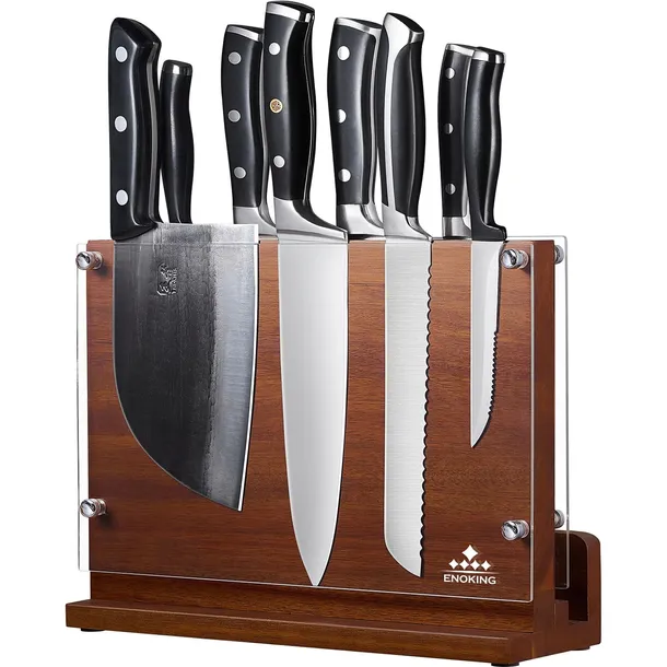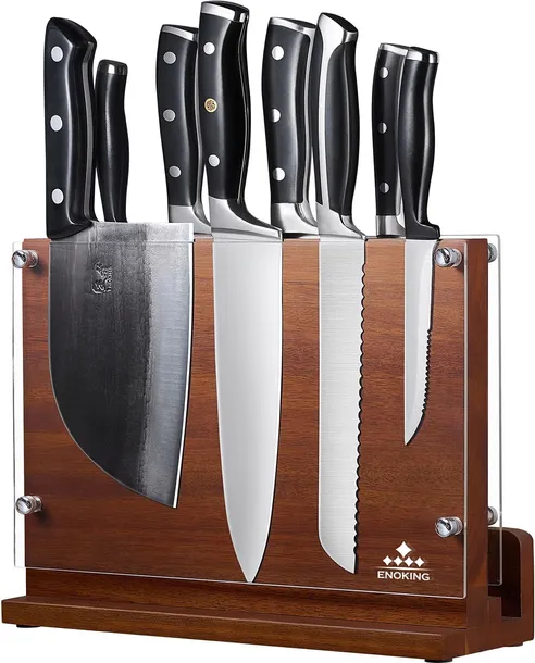 Wyjmowana tarcza ochronna z akrylu – ten magnetyczny blok na noże firmy ENOKING bez noża składa się z przezroczystej akrylowej osłony ochronnej po obu stronach. Może chronić Ciebie i Twoją rodzinę przed ostrzem noża, gdy go wyjmiesz. Akrylową osłonę można zdjąć, gdy nie jest potrzebna lub chcesz wyczyścić blok.