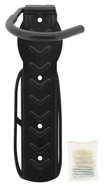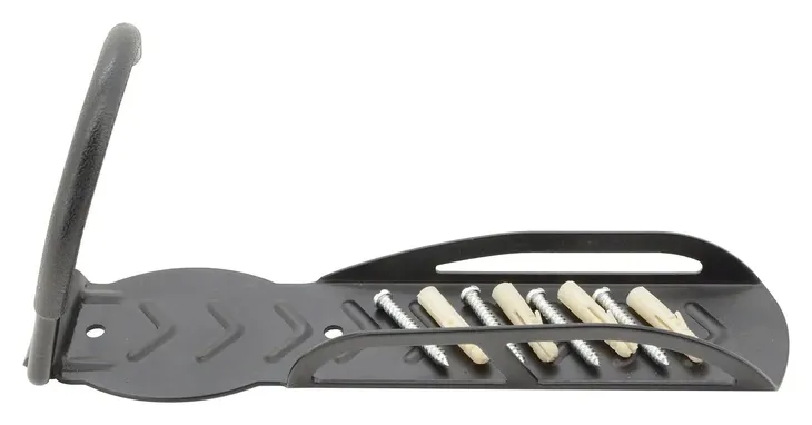 Uchwyt wyposażony jest w haczyk do zawieszenia przedniego koła oraz płytkę prowadzącą, dzięki czemu koło nie zanieczyszcza ściany i jednocześnie zapobiega znacznemu przechylaniu się koła na boki. Możesz łatwo zaoszczędzić miejsce, zawieszając koło w uchwycie. Uchwyt montowany jest w ścianie za pomocą 4 śrub z kołkami. Konstrukcja uchwytu jest w całości metalowa z gumowanym haczykiem, a maksymalna nośność to 20 kg.