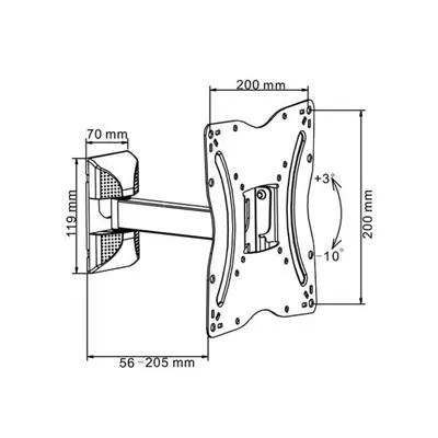 Rozmiar ekranu: 13"~42"Maksymalne obciążenie: 30 kg/66 lbsVESA: 75x75, 100x100, 200x100, 200x200Regulacja w pionie i poziomieRegulacja nachylenia: -10°/+3°Regulacja w poziomie: +90°/-90°Odległość od ściany: 56~205 mmKolor: czarny