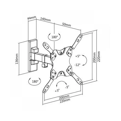 Przeznaczony do telewizorów 13-42"Vesa: 200x200, 200x100, 100x100, 75x75regulacja w pionie +5, -12 stopni.regulacja w poziomie +/- 90 stopniudźwig 20kg