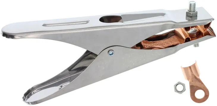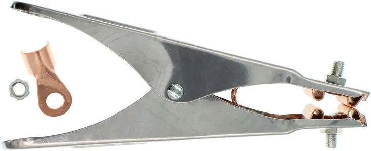 Zacisk masowy kleszczowy 500A wykonany z ocynkowanej i wyprofilowanej blachy. Pokryte miedzią styki na kleszczach są ze sobą połączone specjalną taśmą zapewniając dobre przewodnictwo prądu. Dzięki mocnej sprężynie mogę być dobrze i pewne zamocowane na spawanym materiale. Należy pamiętać, aby do zacisków masowych, biegunowych stosować kable spawalnicze typu H01N2-D.