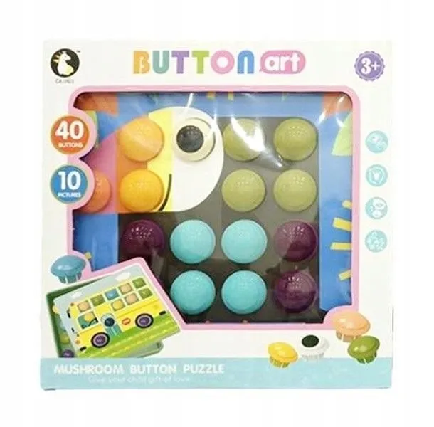 Kolorowa układanka dla dzieci. W zestawie znajduje się 40 kolorowych grzybków, 10 plansz na których układamy kolorowe grzybki, taca i 2 klipsy. Na każdej planszy jest podpowiedź gdzie należy umieścić grzybek w danym kolorze.