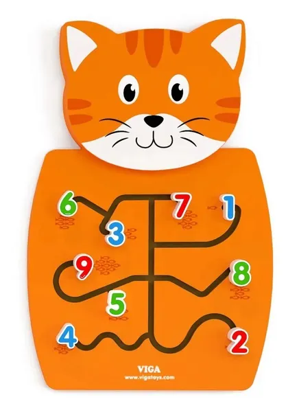 Kotek to labirynt z cyferkami od 1 do 9. Na poszczególnych końcach labiryntu umieszczono rybki. Ile rybek upoluje kotek? Sprawdźcie sami. Dziecko może dopasować cyfrę z ilością rybek narysowaną na panelu lub w inny, dowolny sposób układać cyferki, aby się z nimi zapoznać. Można również bawić się cyferkami, jak labiryntem ćwicząc przy tym motorykę dłoni.