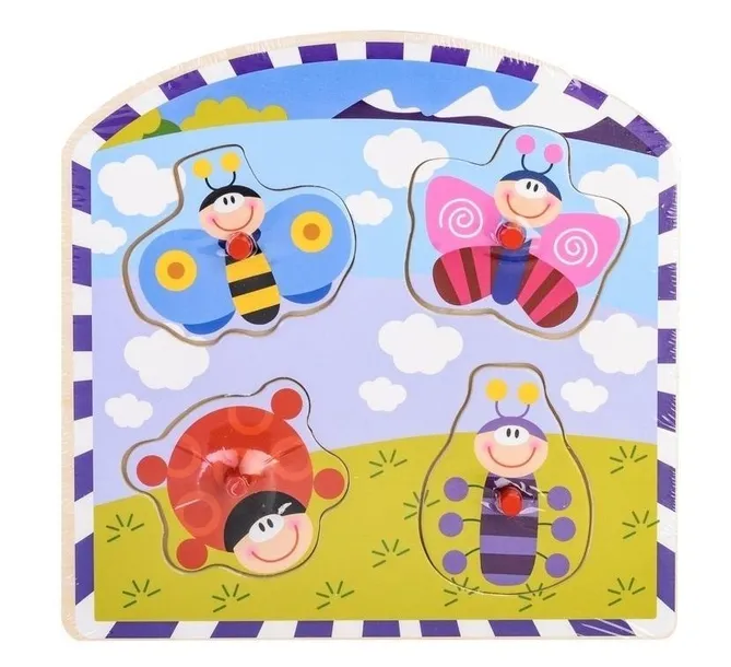 Układanka drewniana na dzieci, rozwija spostrzegawczość i koordynację wzrokowo-ruchową. Puzzle z uchwytami uławiającymi ich przenoszenie. Produkt przeznaczony dla dzieci powyżej 18 miesiąca życia, posiada certyfikat CE