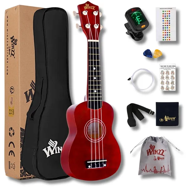 WINZZ Ukulele Sopranowe 21 Cali Czerwony Zestaw Początkujący Pokrowiec