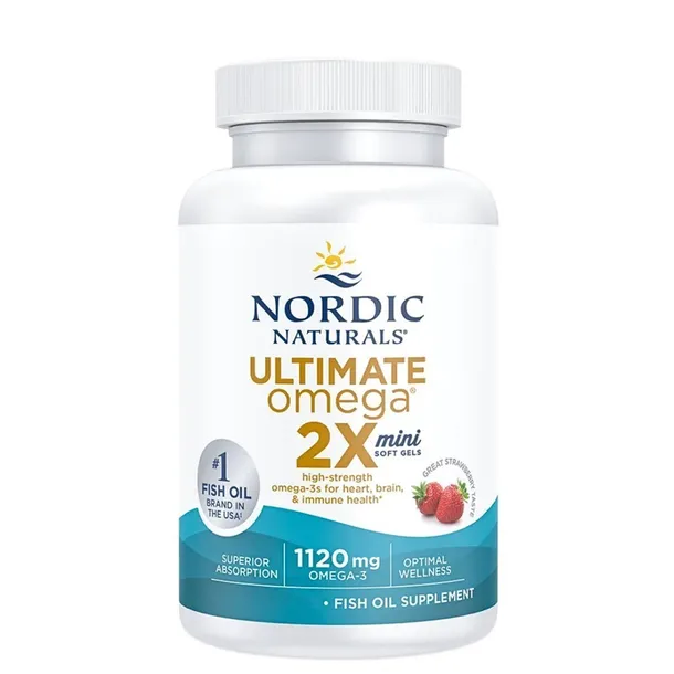 Kwasy omega-3 o smaku truskawkowym do codziennego wsparcia serca i mózgu. 1120 mg Omega-3 w dziennej porcji.SKŁAD:SkładnikiW dziennej porcji (2 kapsułki)Kalorie 15 kcal Całkowita zawartość tłuszczu 1.5 g Tłuszcze nasycone 0 g Tłuszcze trans 0 g Całkowita zawartość kwasów Omega-31120 mg EPA (kwas eikozapentaenowy) 586 mg DHA (kwas dokozaheksaenowy) 456 mg Inne omega-3 78 mgInne składniki:oczyszczony olej z ryb głębinowych (z anchois, sardynek), żelatyna, woda, gliceryna,naturalny aromat truskawkowy, d-alfa-tokoferol, ekstrakt z rozmarynu.SPOSÓB UŻYCIA:2 kapsułki dziennie z posiłkiemPRZECIWWSKAZANIA:Nie należy przekraczać zalecanej porcji do spożycia w ciągu dnia. Suplementy diety nie mogą być stosowane jako substytut (zamiennik) zróżnicowanej diety.Należy zachować ostrożność w przypadku uczulenia na jod, stosowania produktów rozrzedzających krew lub planowanej operacji.SPOSÓB PRZECHOWYWANIA:Przechowywać w suchym i chłodnym miejscu, w sposób niedostępny dla małych dzieci.